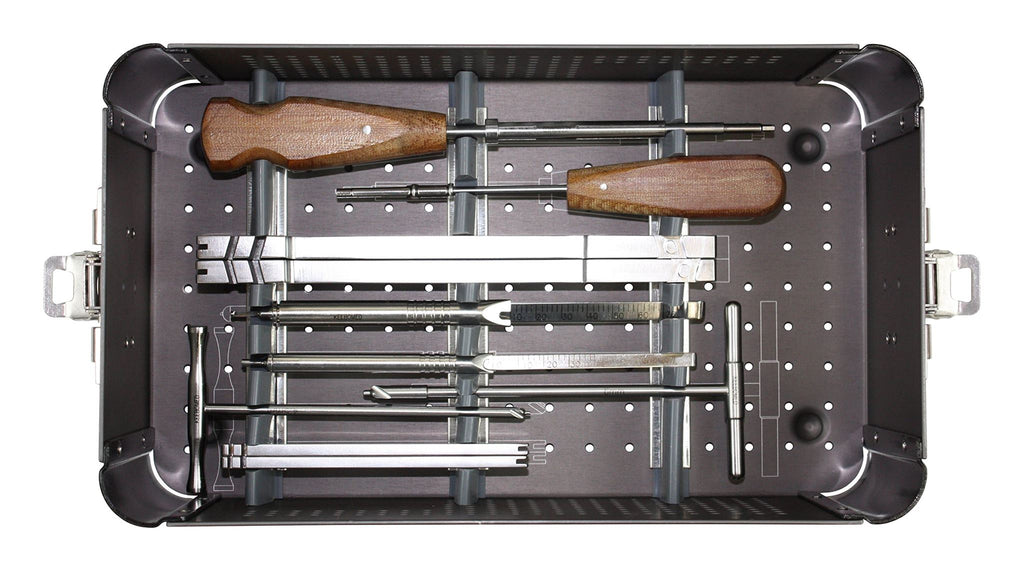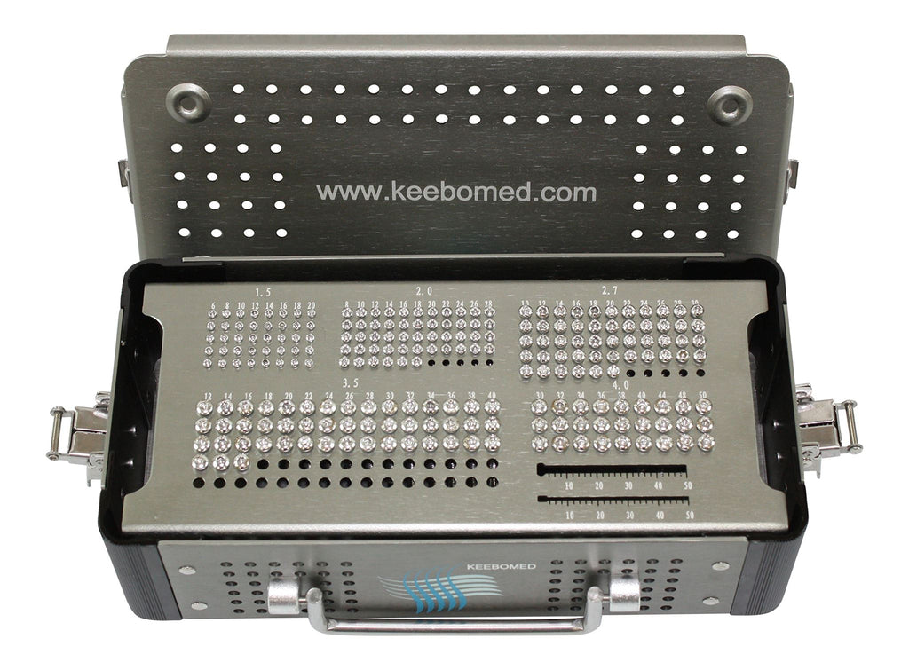 This is a complete kit of orthopedic instruments, bone screws, and bone plates for small autoclaves. Everything is constructed of high quality stainless steel. The cases are made of strong aluminum. All screws are self-tapping with a hex head. Includes 1 Aluminum Case (Approx. Dimensions: 11 3/4"L x 7"W x 4"H); 1 Screw Case 1.5/2.0/2.7/3.5/4.0mm (Approx. Dimensions: 9 1/2�L x 4 1/2�W x 2 5/8�H); 1.1mm Drill Bit (2); 1.5mm x 80mm Drill Bit (2); 2.0mm x 80mm Drill Bit (2); 2.5mm x 115mm Drill Bit (2); 3.2mm x 150mm Drill Bit (2); 1.1mm Neutral & Loaded Drill Guide; 1.5mm Neutral & Loaded Drill Guide; 2.0mm Neutral & Loaded Drill Guide; 2.5mm Neutral & Loaded Drill Guide; 3.2mm Neutral & Load Drill Guide; 1.1mm & 1.5mm Tap Sleeve; 2.5mm & 3.5mm Tap Sleeve; 3.2mm & 4.0mm Tap Sleeve; 2.0mm & 2.7mm Tap Sleeve; HA 1.5mm Tap; HA 2.0mm Tap; HA 2.7mm Tap; HA 3.5mm Tap; HA 4.0mm Tap; Small Screw Forceps; Hex Head Screw Driver SW2.5mm; Hex head Screwdriver 1.5mm; Large 70mm Depth Gauge; Small 40mm Depth Gauge; Large 6.0mm Counter Sink; Small 4.5mm Counter Sink; Small Plate benders (pair); Large Plate benders (pair); Bone plate 1.5mm (5); Bone plate 2.0mm (6); Bone plate 2.7mm (7); Bone plate 3.5/4.0mm (10); Cortical screws self-tapping hex head 1.5mm (40); Cortical screws self-tapping hex head 2.0mm (50); Cortical screws self-tapping hex head 2.7mm (50); Cortical screws self-tapping hex head 3.5mm (48); Cancellous screws self-tapping hex head 4.0mm (27). For Veterinary Use Only in the USA.