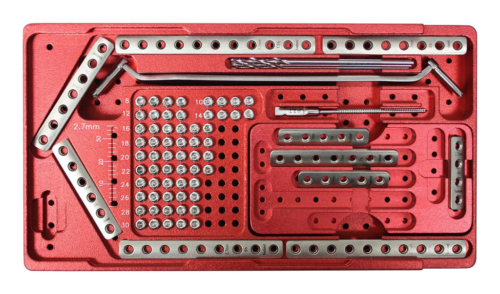 This is a complete micro system with high quality stainless steel plates, self-tapping screws, and instruments. Includes: Bone drill bit 1.1x80mm (5); Bone drill bit 1.5x80mm (5); Bone drill bit 2.0x80mm (5); Bone Tap 1.5mm (1); Bone Tap 2.0mm (1); Bone Tap 2.7mm (1); Screwdriver 1.5/2.0mm (1); Screw holding sleeve 1.5mm (1); Screwdriver 2.7mm (1); Screw holding sleeve 2.7mm (1); Drill Guide 1.1/1.5mm (1); Drill Guide 1.5/2.0mm (1); Drill Guide 2.0/2.7mm (1); Counter drill 4.0mm (1); Straight quick-coupling handle 4.5mm (1); T-shape quick-coupling handle 4.5mm (1); Screwdriver with handle 2.6mm (1); Depth detector 40mm (1); Hook (2); De-coupling (1); Periosteal dissector 3mm (1); Periosteal dissector 5mm (1); Screw holder (1); Plate Forcep (1); Plate Bender 2x1 (set); Elevator 3x1 (1);Bent Reduction Forcep (1); Sharp Reduction Forcep (1); Plate Nipper (1); Multi-functional Forcep (1); Bone plate box 1.5mm (1); Bone plate box 2.0mm (1); Bone plate box 2.7mm (1); Case with lid 15"9"x3" (1); Bone screws 1.5mm self tapping (40) Sizes (6-30mm); Bone screws 2.0mm self tapping (55) Sizes (6-30mm); Bone screws 2.7mm self tapping (60) Sizes (8-30mm); Bone plate 1.5mm (7); Bone plate 2.0mm (10); Bone plate 2.7mm (10). In USA, can only be used for Veterinary field.
