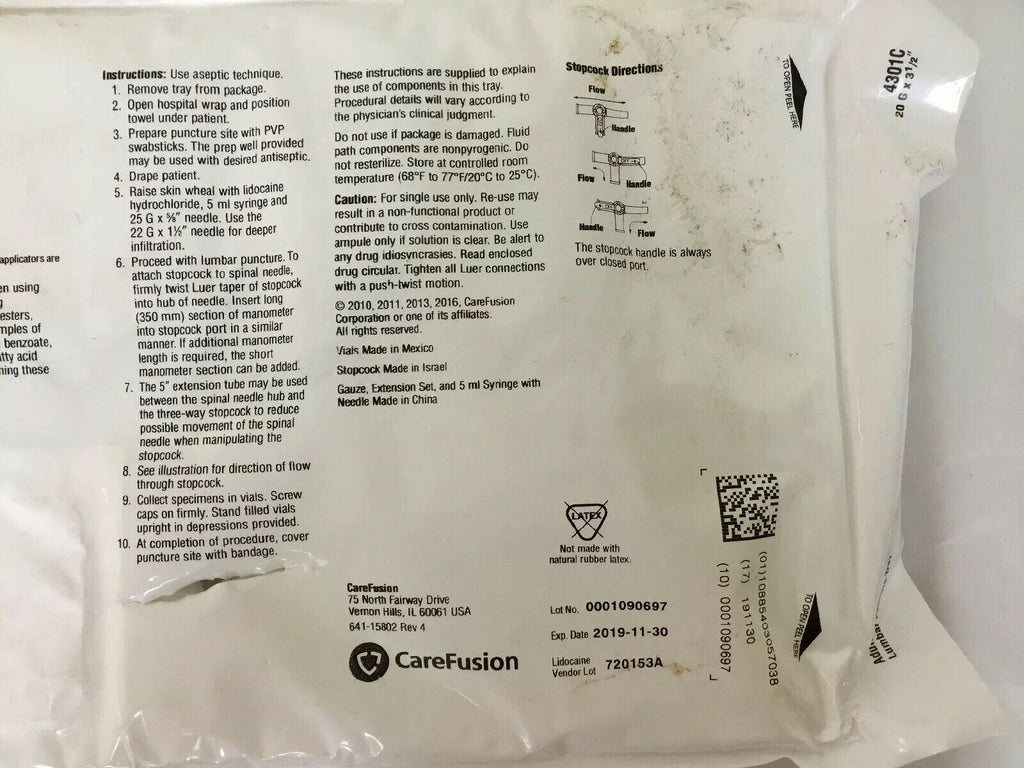 CAREFUSION SAFE-T PLUS ADULT LUMBAR PUNCTURE TRAY WITH 20G X 3.5" CLEAR HUB SPINAL NEEDLE