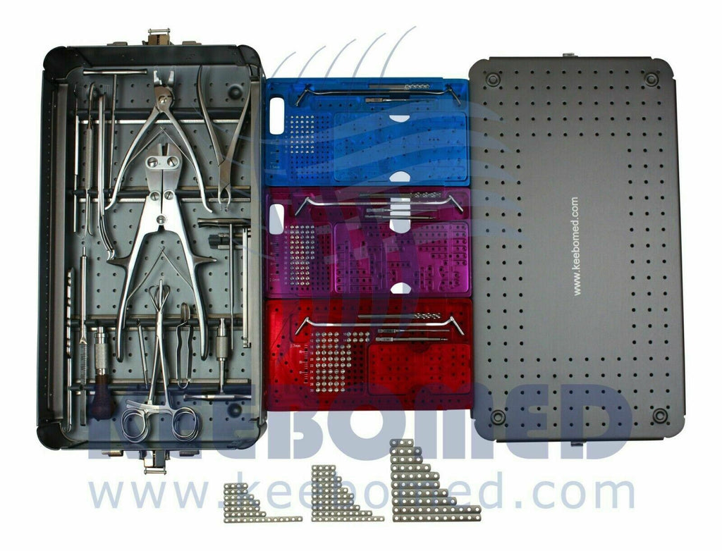 KeeboVet Micro Upgraded System has sizes 1.5mm, 2.0mm, and 2.7mm instruments and implants. This is a complete system that features stainless steel plates, self-tapping screws, and instruments.